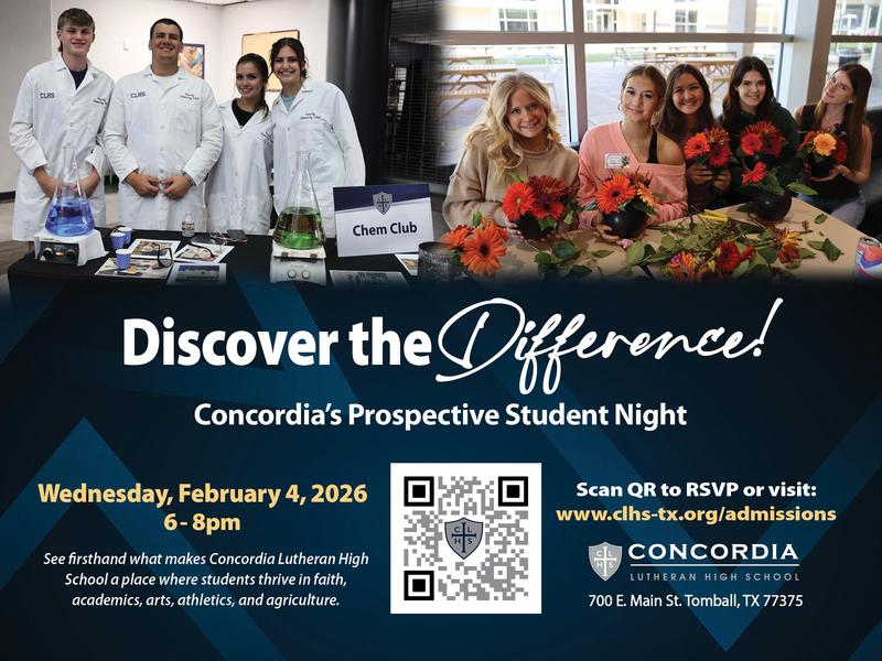 Join us for Concordia's Prospective Student Night Wednesday, February 4th from 6-8pm! Prospective students and families are invited to come to campus for a special evening where they can tour the school, visit with faculty, staff, administration, and coaches while seeing all that we offer here at Concordia.
