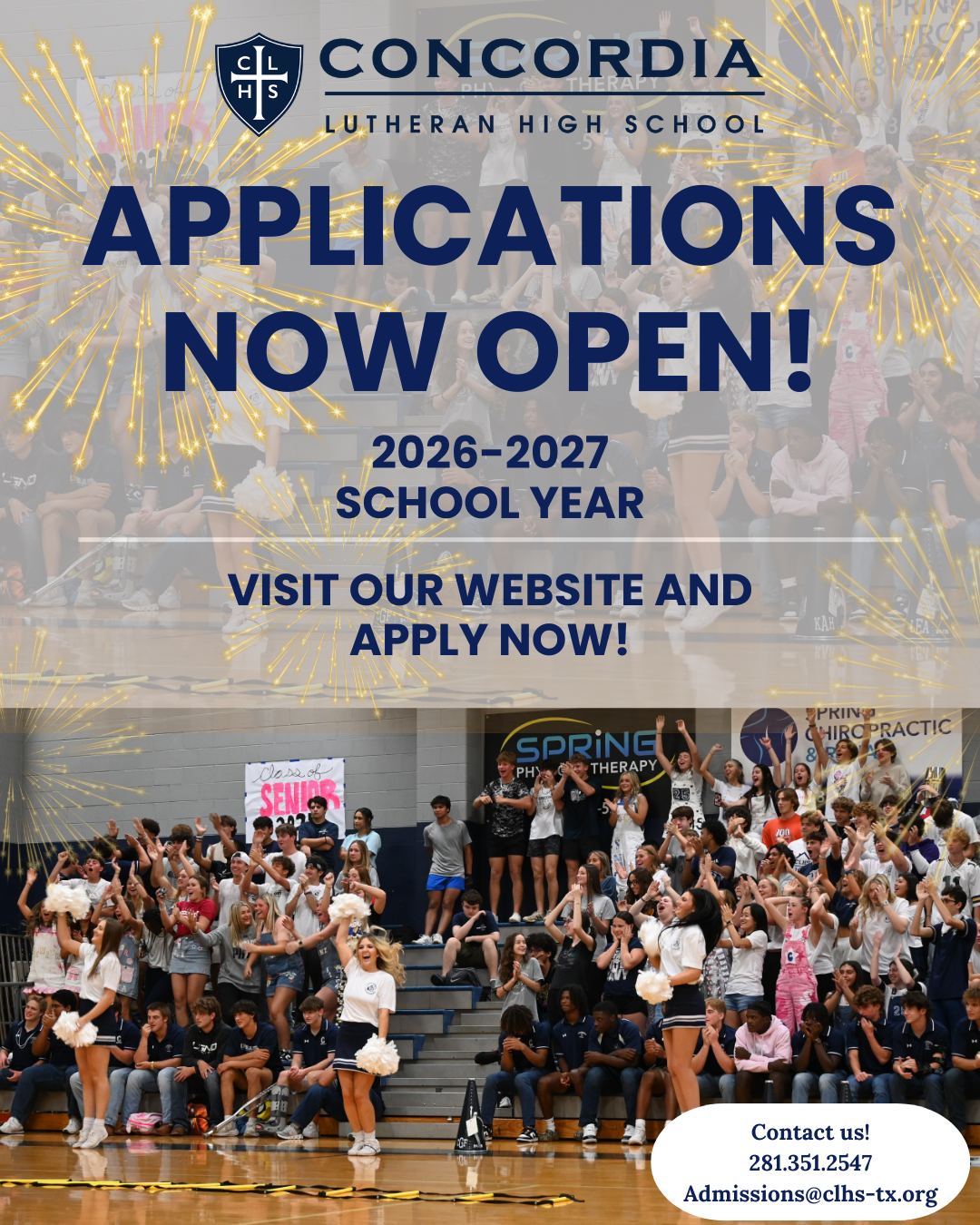 Applications for the 26-27 school year are open and our Priority Acceptance Application Deadline is Feb. 17th. The official Application deadline for next school year is March 6, 2026. Visit www.clhs-tx.org/admissions to learn more about becoming a Crusader. We want YOU to discover the difference at Concordia!